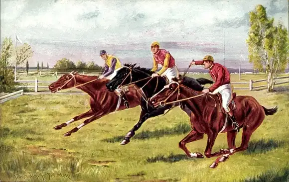 Künstler Ak Donadini, A. E., Jockeys zu Pferden, Springreiten