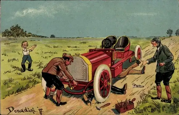 Künstler Ak Donadini jr., Autopanne, Automobil auf der Straße wird repariert
