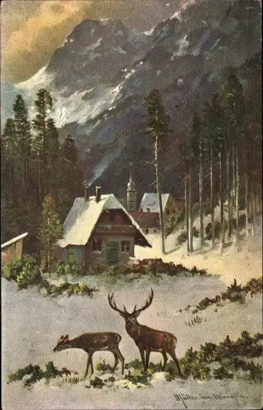 Künstler Ak Dorfpartie, Berglandschaft, Hirsch