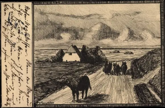 Künstler Ak Dorfpartie, Im Hintergrund eine Hütte, Kühe