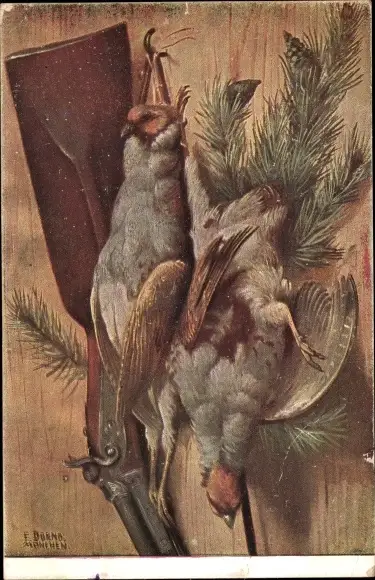 Künstler Ak Dorno, Jagdgewehr mit erlegten Vögeln