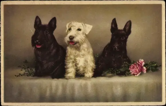 Künstler Ak Drei Hunde, zwei schwarze und ein weißer Terrier