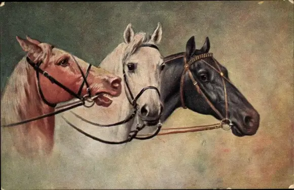 Künstler Ak Drei Pferde mit Zaumzeug, Pferdeköpfe, Pferdestudie