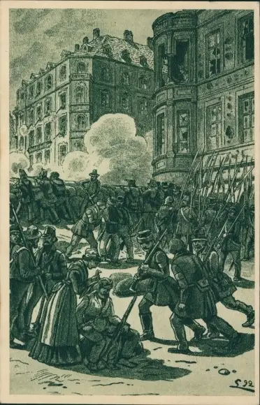 Künstler Ak Dresden, 100 Jahre Revolution von 1848, Straßenkampf, Barrikade, Große Frauengasse