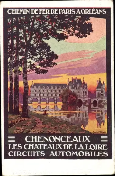 Künstler Ak Duval, C.Chenonceaux Indre et Loire, Le Chateau, Circuits Automobiles, Chemin de fer de