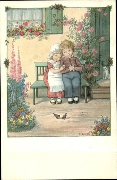 Künstler Ak Ebner, Pauli, Junge undd Mädchen auf einer Bank im Garten