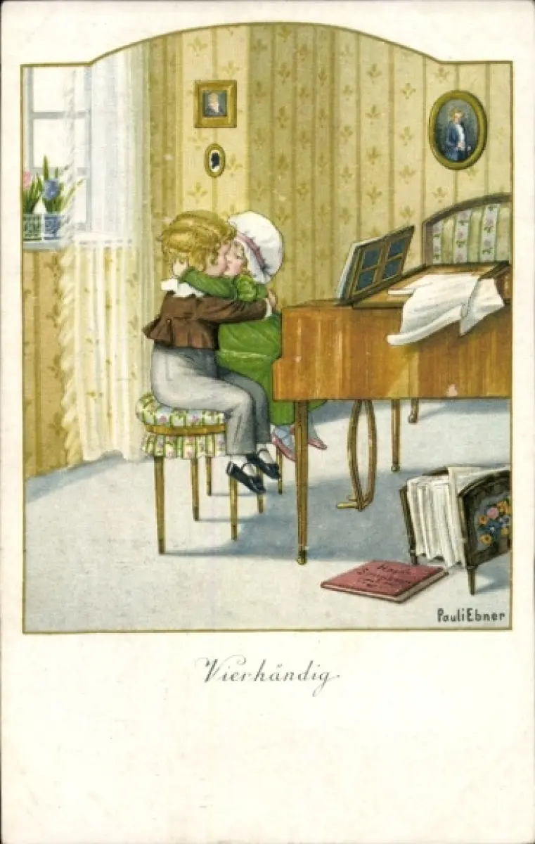 Künstler Ak Ebner, Pauli, Vierhändig, küssendes Paar am Klavier