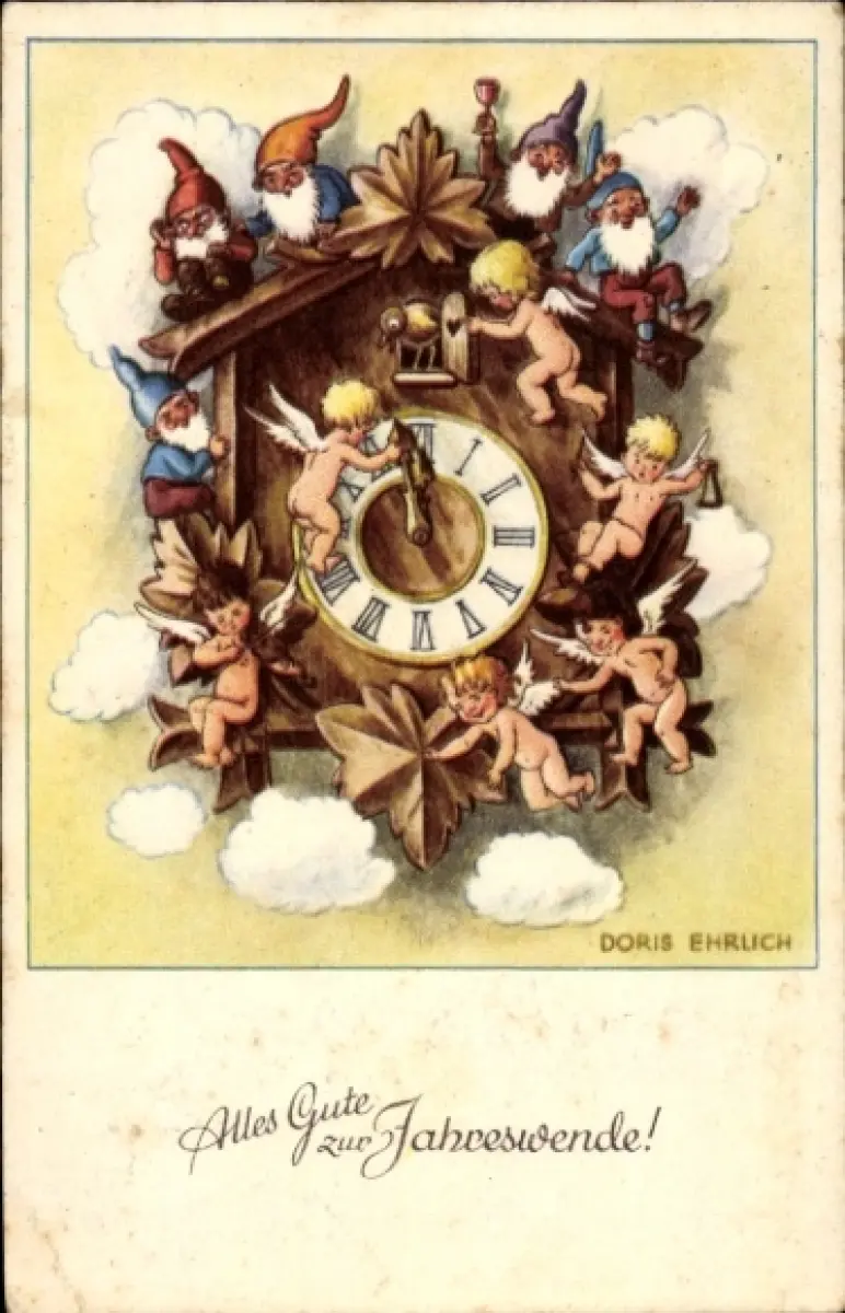 Künstler Ak Ehrlich, Doris, Glückwunsch Neujahr, Zwerge, Engel, Uhr