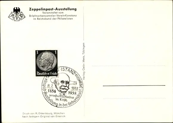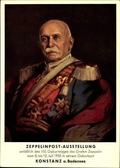 Künstler Ak Emerich, Graf Zeppelin, Portrait, Uniform, Orden, Zeppelinpost Ausstellung Konstanz 1938