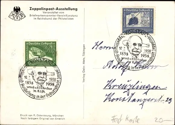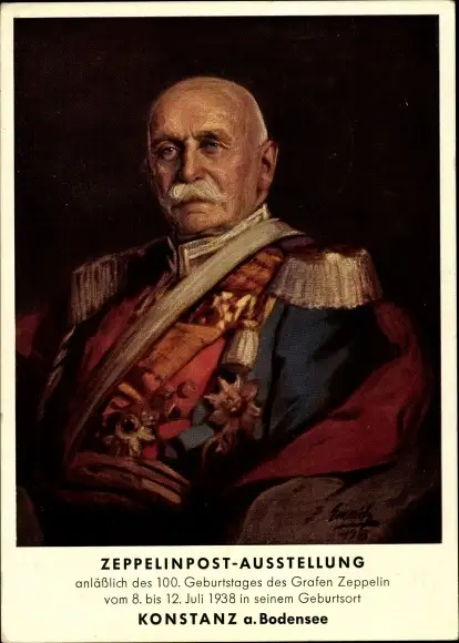 Künstler Ak Emerich, Porträt Graf von Zeppelin, Uniform, Orden, Zeppelinpost Ausstellung 1938
