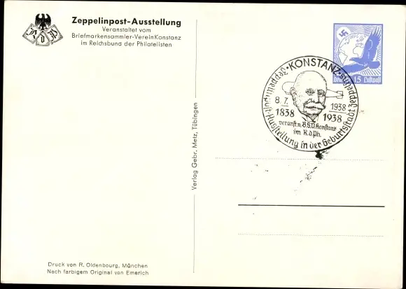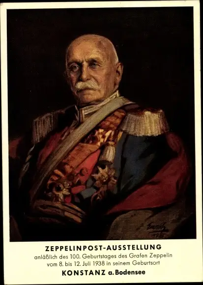 Künstler Ak Emerich, Portrait Graf Zeppelin, Uniform, Orden, Zeppelinpost Ausstellung Konstanz 1938