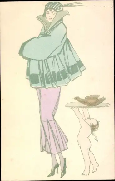 Künstler Ak Engel reicht Frau im Mantel eine Ente auf einem Tablett