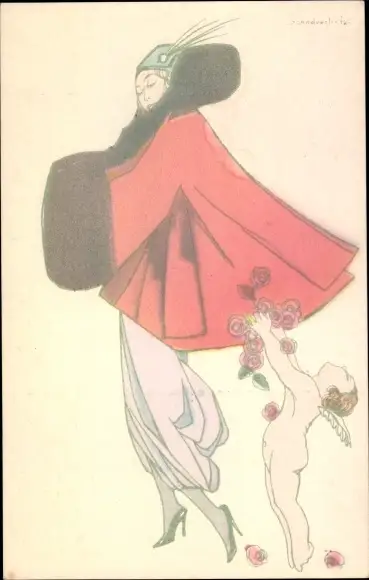 Künstler Ak Engel reicht einer Frau im Mantel Rosen