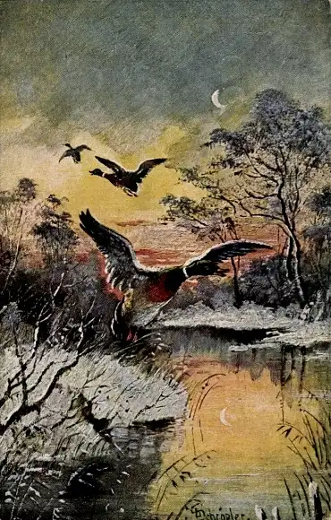 Künstler Ak Enten im Flug bei Nacht, Gewässer