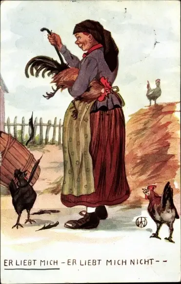 Künstler Ak Er liebt mich, er liebt mich nicht, Bäuerin beim Federrupfen eines Hahnes