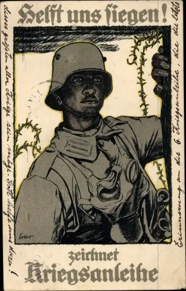 Künstler Ak Erler, Helft uns siegen, zeichnet Kriegsanleihe, Soldat in Stahlhelm mit Gasmaske, I. WK