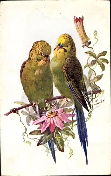 Künstler Ak Eudes, Zwei Papageien, Blume
