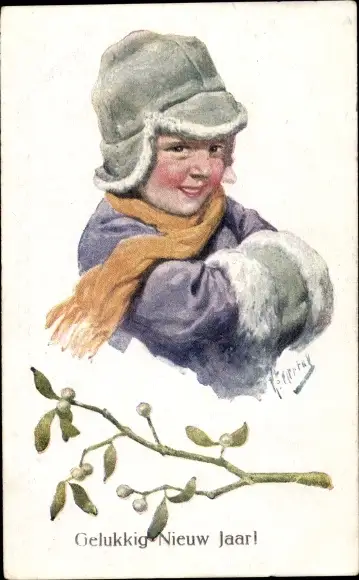 Künstler Ak Feiertag, K., Kind in Winterkluft, Glückliches Neujahr, BKWI 3198/3