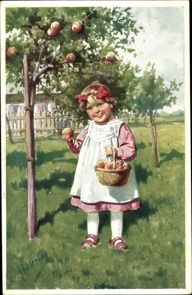 Künstler Ak Feiertag, Karl, Mädchen mit Früchten, Korb, Obstbäume