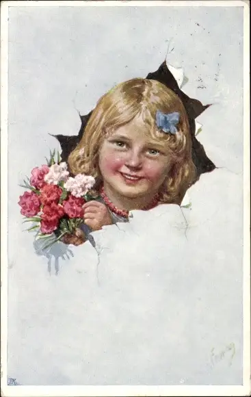 Künstler Ak Feiertag, Karl, Portrait eines Mädchens, Blumenstrauß