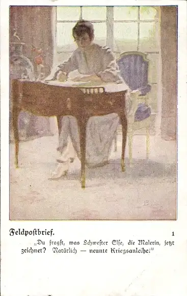 Künstler Ak Feldpostbrief, Frau beim Schreiben