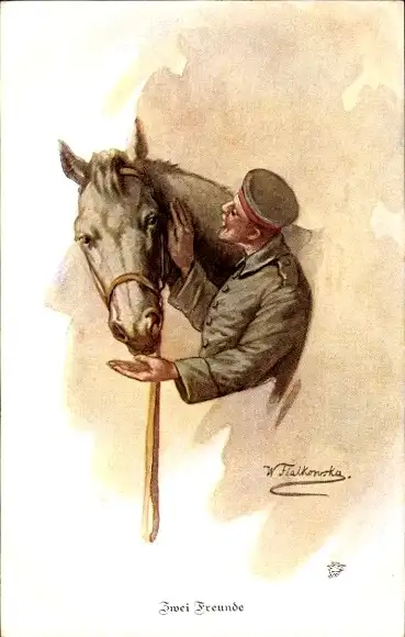 Künstler Ak Fialkowska, W., Zwei Freunde, Soldat und Pferd