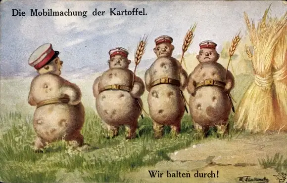 Künstler Ak Fialkowska, Wally, Die Mobilmachung der Kartoffel, Wir halten durch, Vermenschlichtes