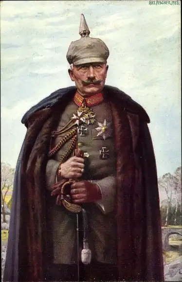 Künstler Ak Fischer, Art., Kaiser Wilhelm II., Portrait in Uniform, Mantel, Pickelhaube