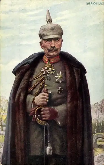 Künstler Ak Fischer, Kaiser Wilhelm II., Portrait in Uniform, Mantel, Pickelhaube