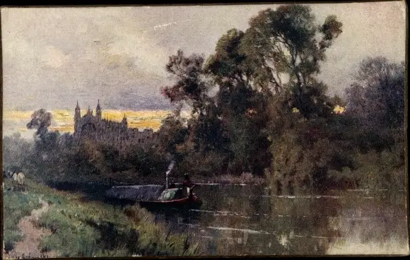 Künstler Ak Flusspartie, Boot, Bäume, Im Hintergrund Schloss