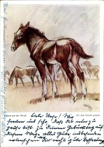 Künstler Ak Fohlen auf der Weide, mit dem Mund gemalt