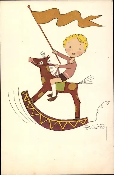 Künstler Ak Foy, Andre, Junge auf einem Schaukelpferd