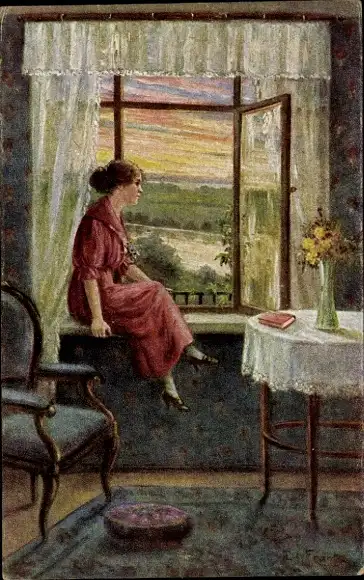 Künstler Ak Frank, E., Abenddämmern, Frau sitzt auf der Fensterbank