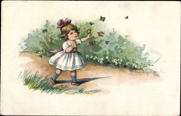 Künstler Ak Frank, Elly, Mädchen umgeben von Schmetterlingen