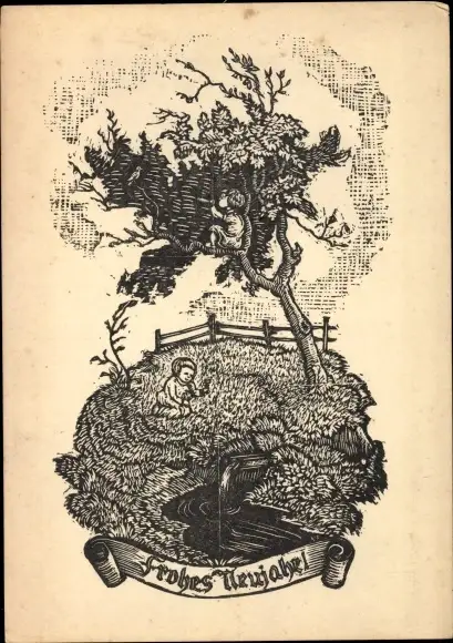 Künstler Ak Franke, Kurt, Glückwunsch Neujahr, Kinder am Wasser, Baum