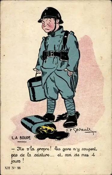 Künstler Ak Französischer Soldat, verschüttete Suppe