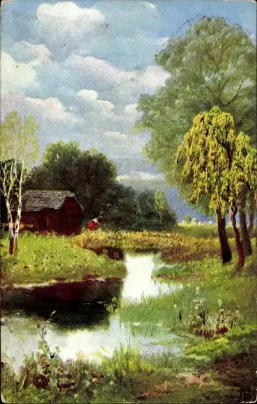 Künstler Ak Frau am Fluss, Bäume, Dorfidyll