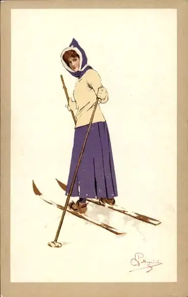 Künstler Ak Frau auf Skiern in Winterkleidung