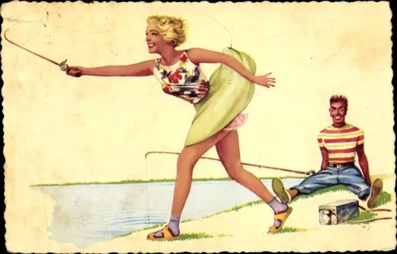 Künstler Ak Frau beim Angeln, Angelhaken hebt Rock hoch