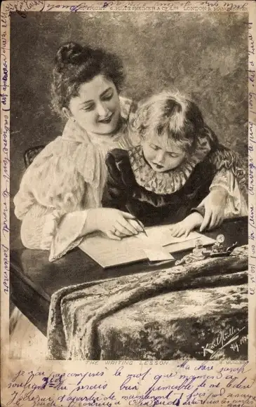 Künstler Ak Frau bringt ihrer Tochter Schreiben bei