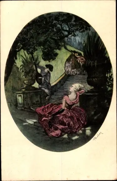 Künstler Ak Frau hört einem maskierten Lautenspieler zu