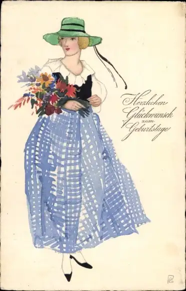 Künstler Ak Frau in blauem Kleid mit Blumenstrauß