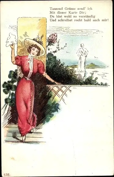 Künstler Ak Frau in rotem Kleid, "Tausend Grüsse send ich..."