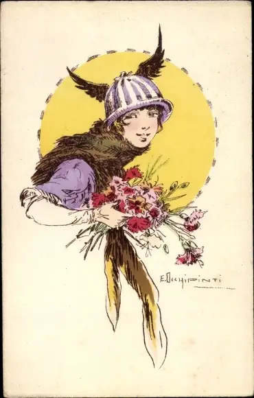 Künstler Ak Frau mit Blumenstrauß, Mütze mit Flügeln, Portrait