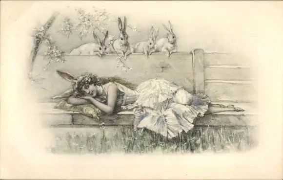 Künstler Ak Frau mit Hasenohren liegt auf einer Bank, Kaninchen