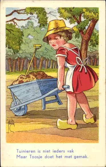 Künstler Ak Frau mit Holzschuhen und Schubkarre