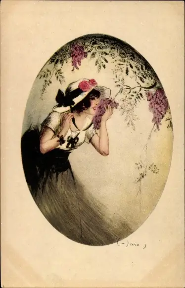 Künstler Ak Frau mit Hut riecht an einer Blüte