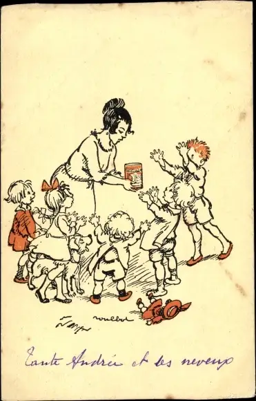 Künstler Ak Frau mit Kindern, Dose, Essen, Puppe