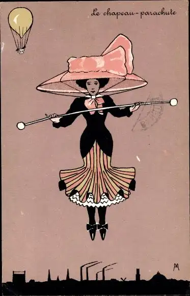 Künstler Ak Frau mit riesigem Hut als Fallschirmspringerin, Ballon