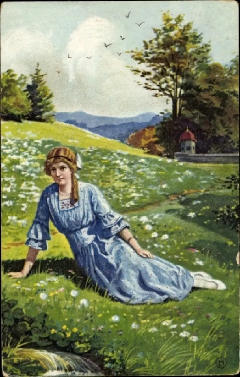 Künstler Ak Frau sitzt auf einer Wiese